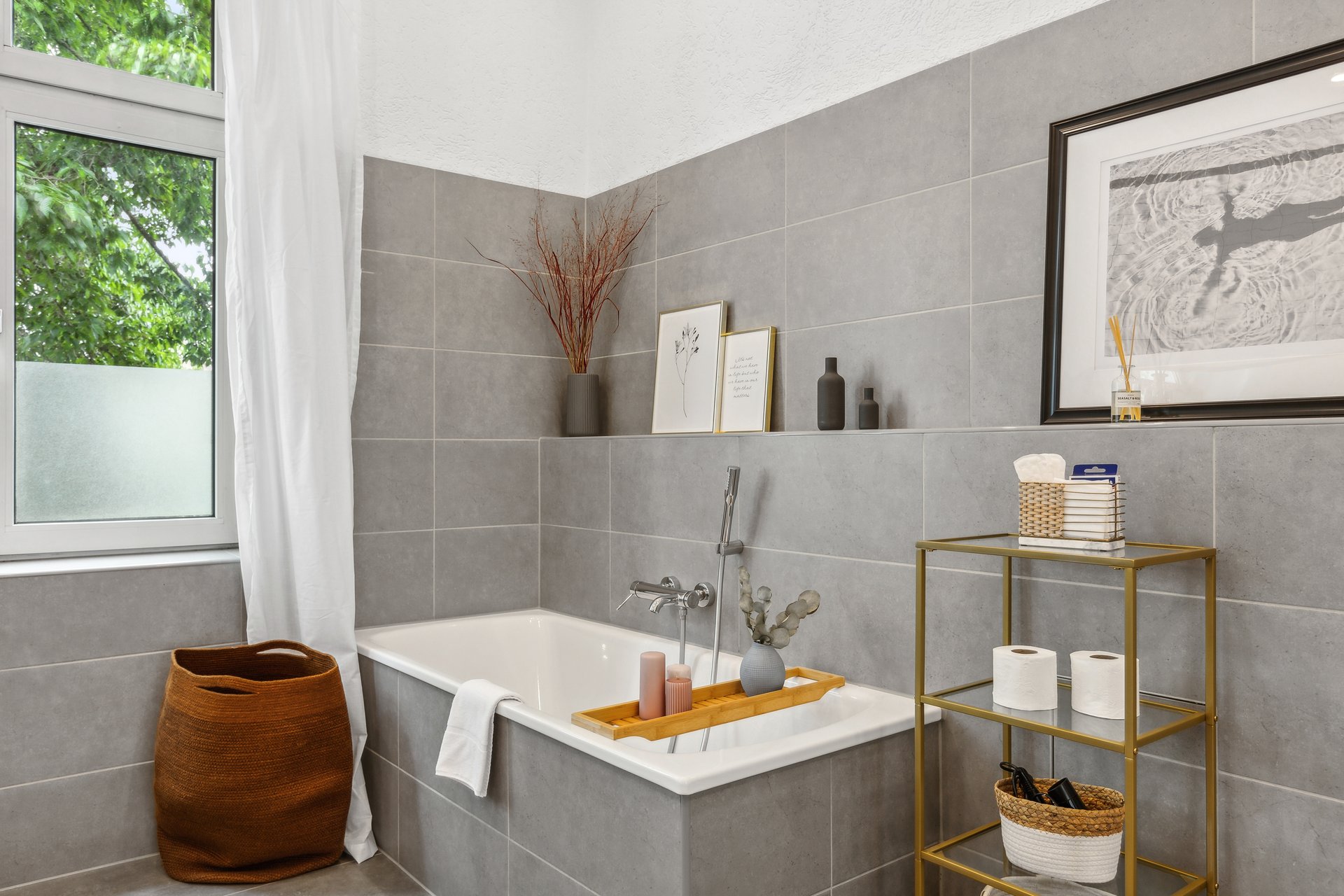Nach einem erlebnisreichen Tag kannst du dich im modernen Badezimmer erfrischen. Dank kostenfreiem WLAN bleibst Du immer verbunden. Die Waschmaschine und der Trockner sorgen für frische Kleidung. Ein Bügeleisen und Bügelbrett stehen ebenfalls bereit.