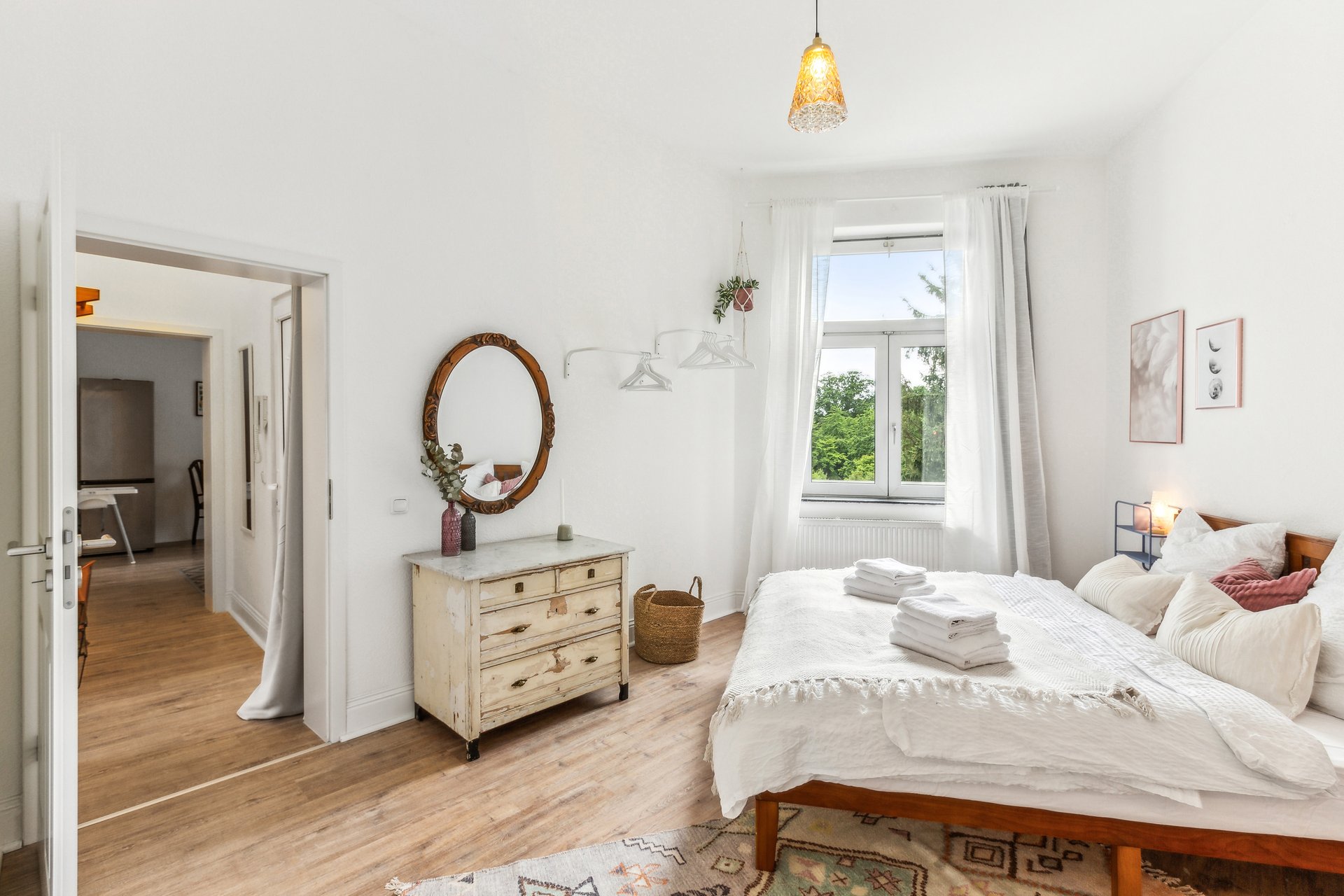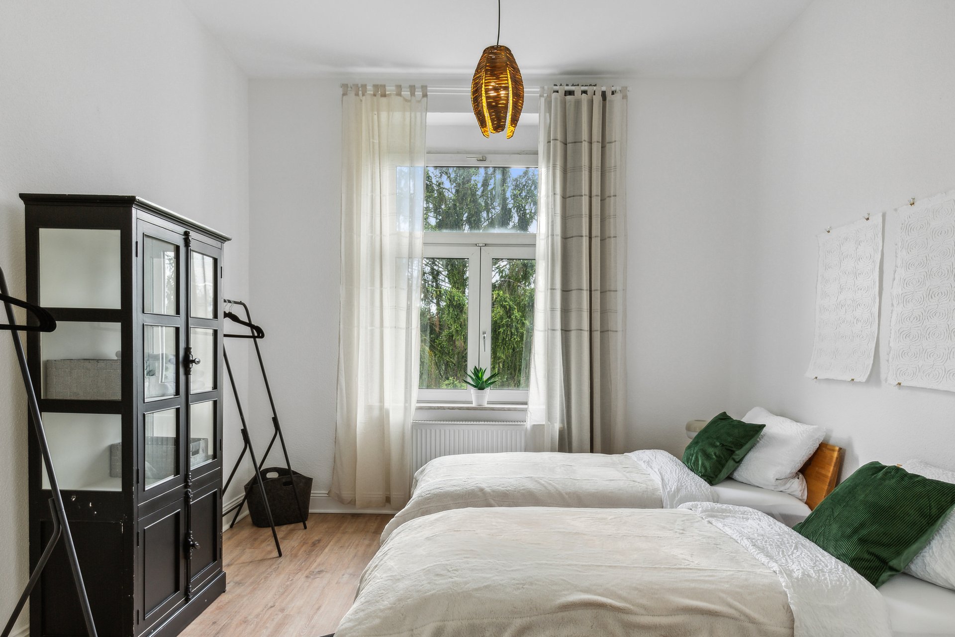 Die Wohnung bietet Platz für bis zu 6 Personen: zwei Kingsize-Betten in den Schlafzimmern und eine ausziehbare Couch auf 160x200 cm im Wohnzimmer.