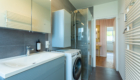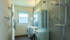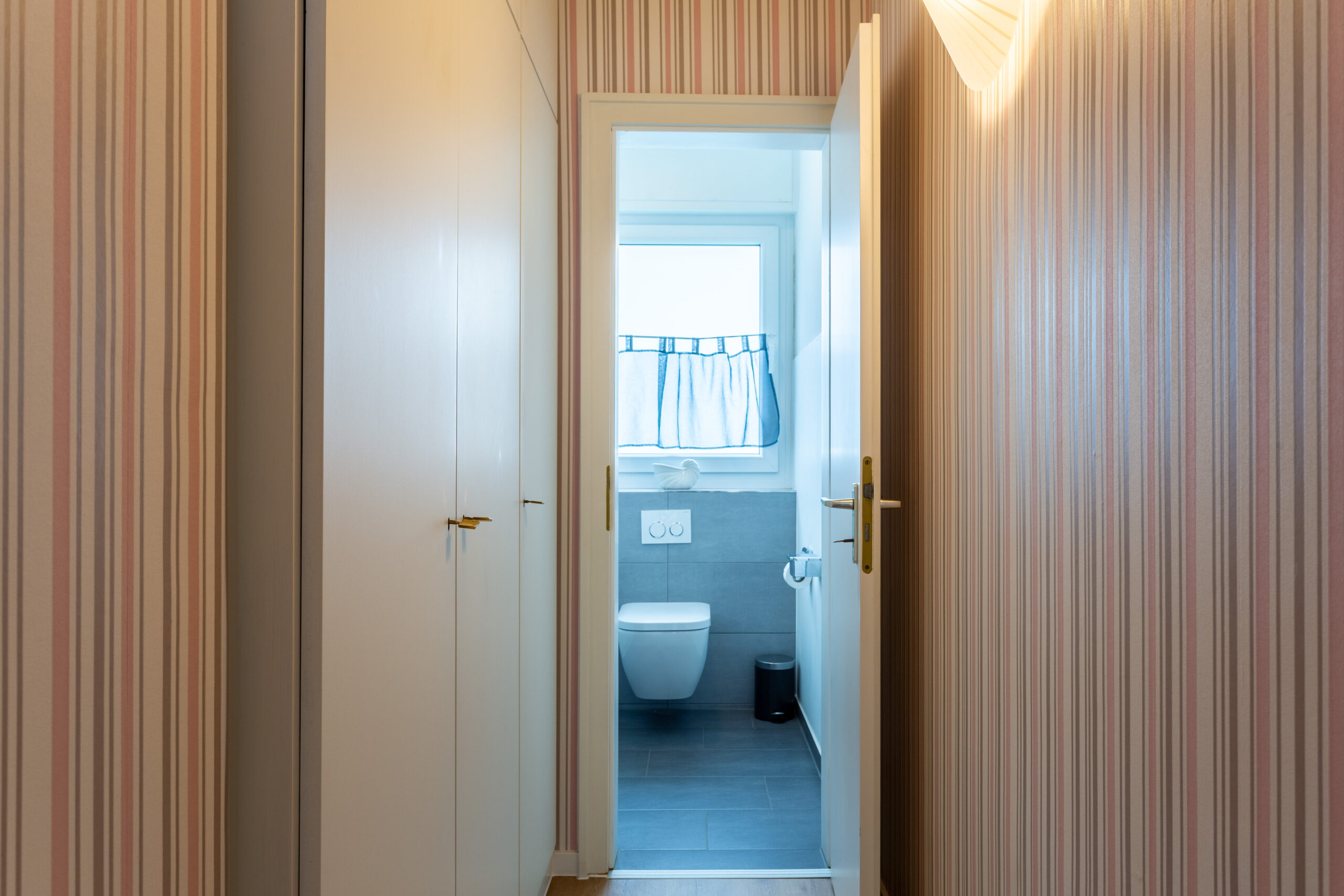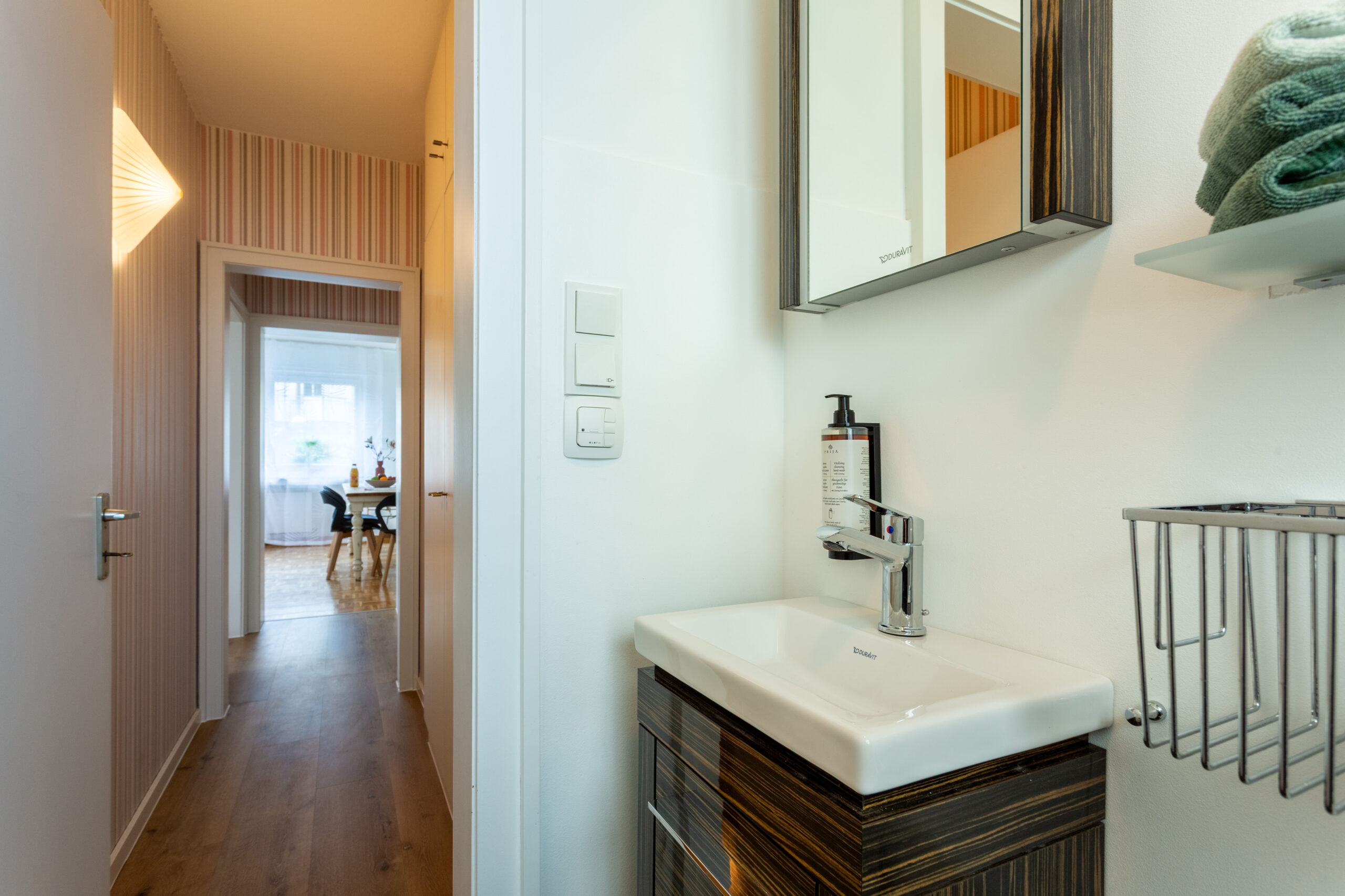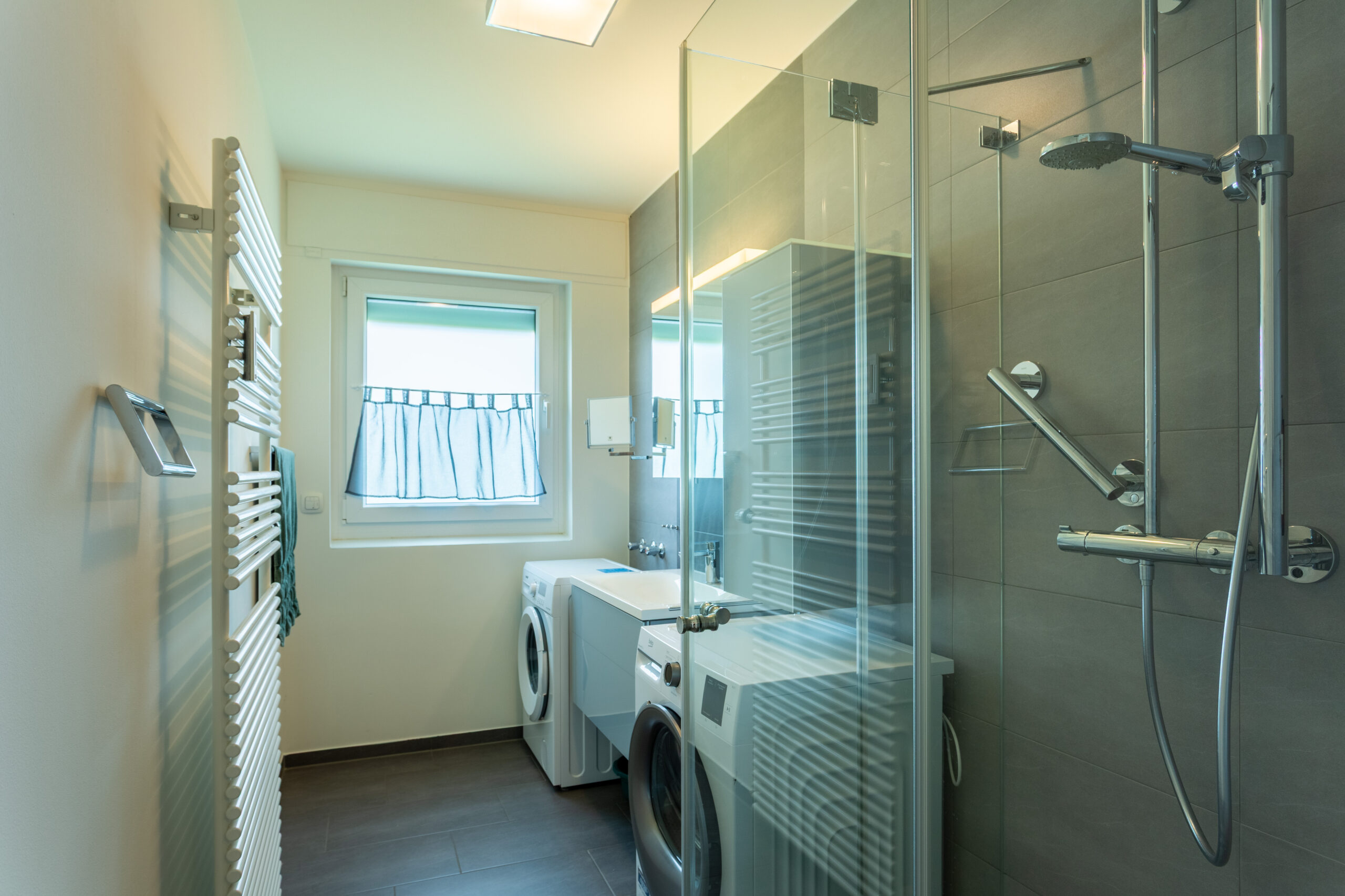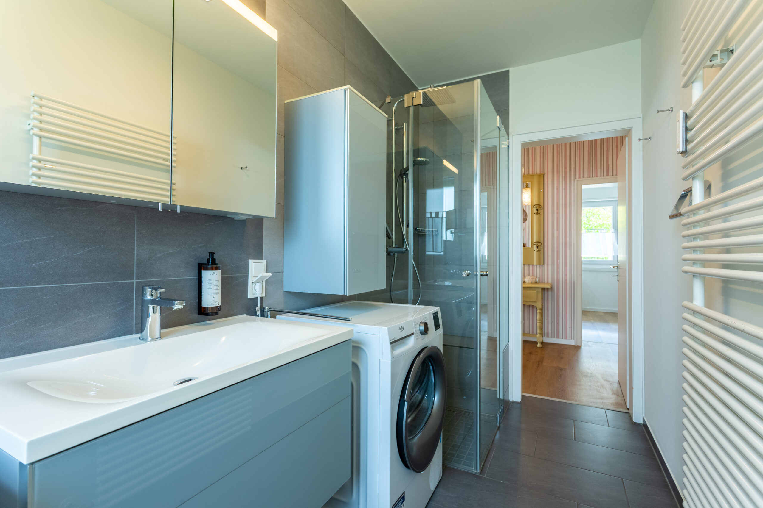 Nach einem erlebnisreichen Tag wartet das moderne Badezimmer mit Dusche, Waschmaschine und Trockner auf dich. Zusätzlich gibt es ein separates WC, was besonders bei voller Belegung praktisch ist.
