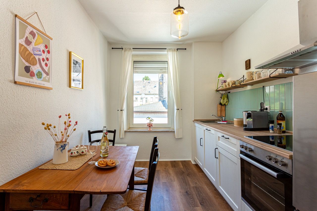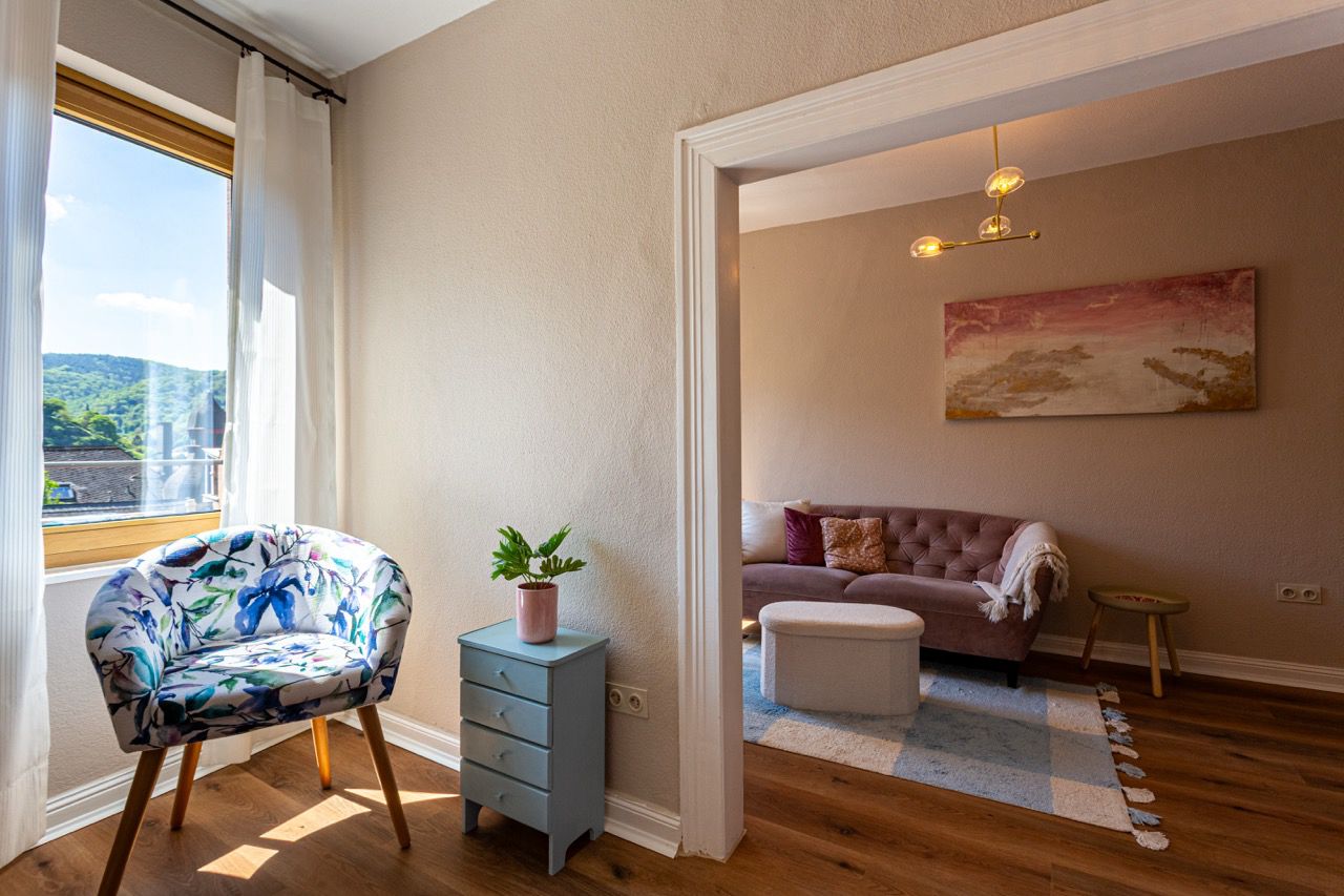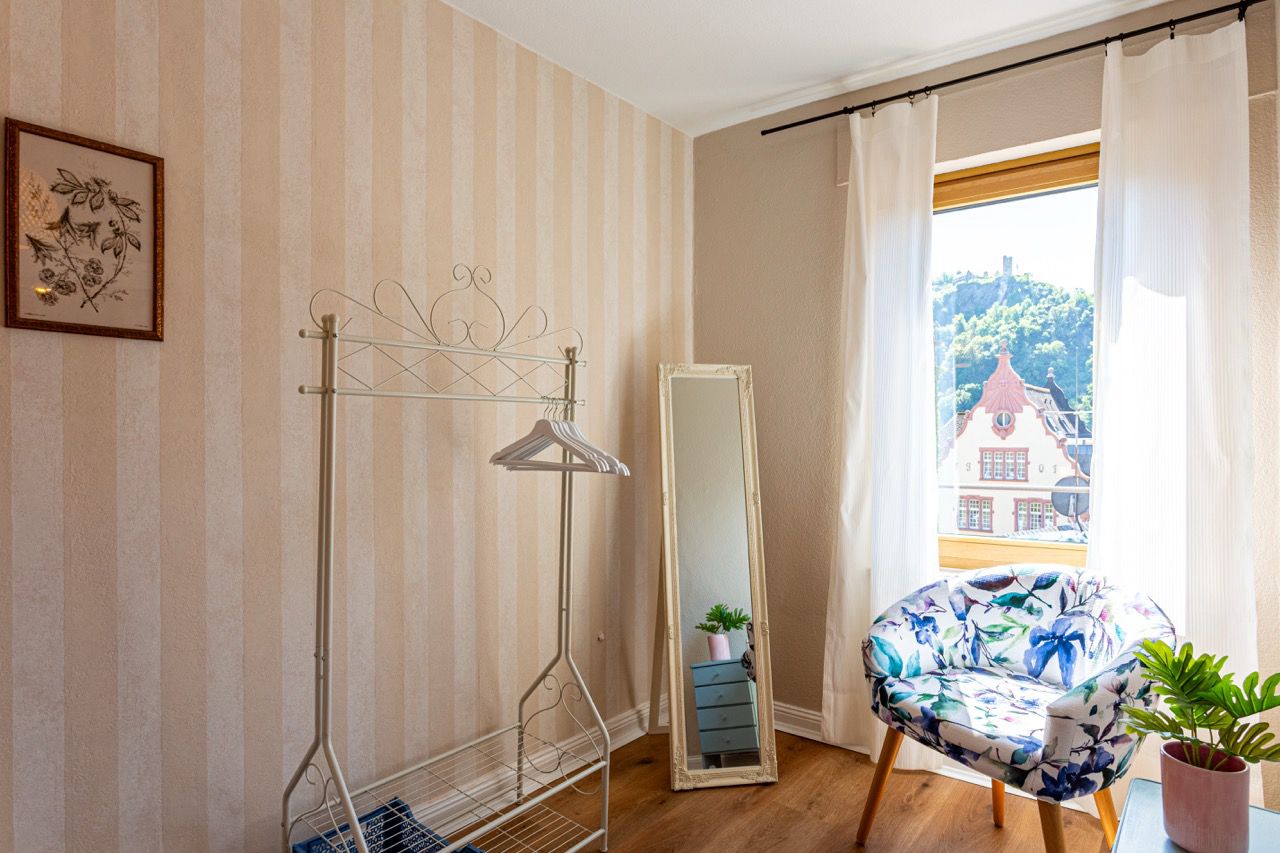 In dieser charmanten Wohnung genießt Du einen einzigartigen Blick auf die imposante Grevenburg und das historische Rathaus von Traben-Trarbach – ein Panorama, das Geschichte und Atmosphäre vereint.